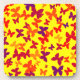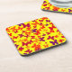 A bright summery coaster set featuring a pattern of butterflies in orange, pink, red and purple ona bright yellow background.