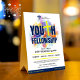 Promote your church's youth fellowship service events with this minimalist fun and colourful table tent sign featuring paint splatters, a yellow cross, and blue typography. Customise to your liking.