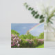 blooming lavender lilacs among lush green trees with a magical rainbow arching overhead