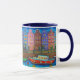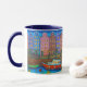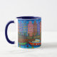 A vibrant and lively stylised night scene of Amsterdam's colourful, narrow houses along the canals on a mug by popular artist Lisa Lorenz©