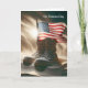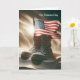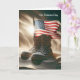 A pair of rugged combat boots on in windswept desert sand with an American flag waving dynamically above them