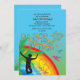A colourful invitation to a bounce house birthday party. It features a rainbow, birds, foliage and abstract swirls against a blue background. Perfect for an outdoors celebration.
