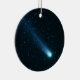 A blazing comet creates a brilliant fuzzy ball in the night sky, followed by a blue wispy tail as it moves slowly among the stars in this enhanced stellar view.