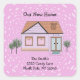 A cosy comfortable house. A swirly dot pink background. Shrubs and a mat at the front door. Customise with all of your information as desired.