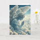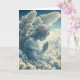 A peaceful angel with large white wings is shown praying while floating in soft clouds. She wears a flowing robe and has gentle features with her eyes closed. The colors are light blue and white, giving the image a calm, heavenly feeling.