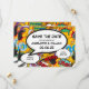 A fun, cool and trendy comic book inspired save the date card that puts the wham, zap, pow into your wedding date announcement. The reverse features a matching comic book pattern which you can replace with your own image or photo. Designed by Thisisnotme©