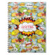 Comic Book notebook with sayings like Boom! Pow! and Poof! Cannon balls and thought clouds in colours of red, yellow, green on a light blue background. You can write whatever you like. The word "Notes" is editable and you can add your name. If you click on the "customise further" link/button you can change the font and font colours.