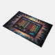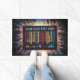 A doormat with a funny barcode design that says Scan Your Feet Here. The barcode is made of colourful lines and includes footprints in the bottom row.