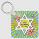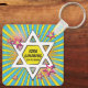 Unique and fun pop art comics comic book Bar Mitzvah personalised keychain favour. This comic book Bar Mitzvah personalised keychain is modelled after a comic strip like you'd see in the comics section of a newspaper or what you'd see in superhero comic books. It's done up in the pop art comic book style with bright colours, sunbursts and a Jewish Star of David. The colours on this comic book themed Bar Mitzvah personalised keychain are bright blue, yellow, green, orange, pink, black, and white.