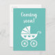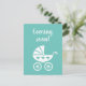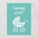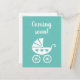Coming soon cute pregnancy announcement cards with baby carriage design. Custom postcard for expecting a new baby girl or boy. Custom background colour with bbay stroller / buggy. Also great for baby shower party. Add your own lovely message on the back. Elegant brush script typography template.