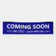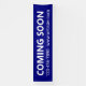 This coming soon banner is navy blue. The text is white. Coming soon is a large font. It is above additional text that you can edit to show a custom message such as your phone number and website.
