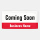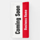 This outdoor banner is bright red, black, and white. You can edit the text to meet your needs. You can add your custom message (shown: Coming Soon Business Name). The top is white with black text. The bottom is bright red with white text for your phone number or custom text. All text can be edited or deleted.