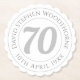 Commemorative birthday celebration coaster with person's name, and the date of their birthday. A paper coaster for someone who is 70
