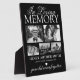 Personalised family memorial plaque featuring a stylish black background that can be changed to any colour, 5 photos of your lost loved one, the text "in loving memory", their name, birth/death dates, a white heart, and the remembrance saying "gone but never forgotten".