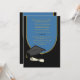 A blue graduation sash trimmed in gold, over a black robe holds your personalised wording. A graduation cap and diploma embellish the card. The black flourish can be dragged to any location, made larger or smaller or eliminated.
