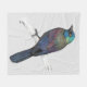 A coloured pencil drawing of a common grackle. You can see the bird from its shiny back, where you can see its beautiful iridescent colours.