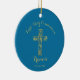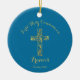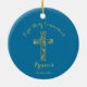 Modern First Holy Communion gold cross boys name ornament with a blue background. Personalize with your name and date.
