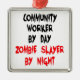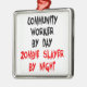 This eerie bloody text design featuring the phrase "Community Worker by Day Zombie Slayer by Night" is perfect for any community worker who loves zombies.