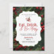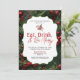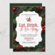 Company Holiday Party Invitation Eat, Drink and Be Merry. features elegant red and green pine needles, holly berries and red bow.