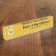 Office desk name plate with logo template. Include a name in black text with a smaller line of text for a title or position. The background is gold and the small template is on the left side.