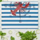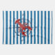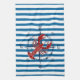 Bright blue and white horizontal pattern design kitchen towel features a nautical ocean theme with a ship's compass and a lobster.