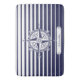 A nautical design with an ornate compass rose on blue and white stripes and a label with customisable text.