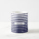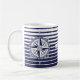A nautical design with an ornate compass rose on blue and white stripes and a label with customisable text.