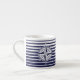 A nautical design with an ornate compass rose on blue and white stripes and a label with customisable text.