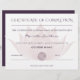 Elegant certificate of completion for yoga and reiki training courses achievement with a beautiful and modern moiré effect lotus flower. Text and logo to personalize. Main color : muted purple.