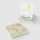 The coasters are gorgeous, a quality feel and heavy weight. They look like a precious archeological find. A rustic stone juxtaposed with a modern floral black and white print. I like the way the print goes slightly imperfect on the cut stone edges giving them a kind-of natural beauty.