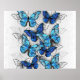 Vertical composition of realistic, blue and white morpho butterflies on grey textured background. Morpho blue butterfly.