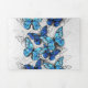 Vertical composition of realistic, blue and white morpho butterflies on grey textured background. Morpho blue butterfly.