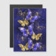 Composition of luxurious sapphire and gold jewellery butterflies on blue textured background.