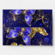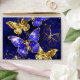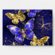 Composition of luxurious sapphire and gold jewellery butterflies on blue textured background.