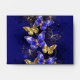 Composition of luxurious sapphire and gold jewellery butterflies on blue textured background.