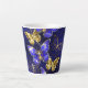 Composition of luxurious sapphire and gold jewellery butterflies on blue textured background.