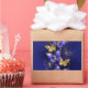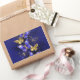 Composition of luxurious sapphire and gold jewellery butterflies on blue textured background.