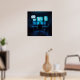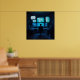A silhouette of a figure in a chair lit by the light from computer screens. This compelling artwork features a figure viewed from behind, seated before a bank of glowing computer monitors in a dimly lit room. The screens, varying in size and orientation, emit a cool blue and teal light, illuminating the subject and hinting at complex information. The piece skilfully captures the atmosphere of deep concentration and the visual allure of data streams and digital interfaces. An ideal piece for a modern office, gaming room, or as a statement on contemporary work culture. Perfect for those who understand the dedication and focus required in the digital age, highlighting both the allure and the isolation of deep engagement with technology. This artwork is can be customised, printed and or downloaded.