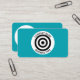 A business card template with a target like symbol made up of concentric circles. The symbol is placed in a white circle with curved text company name and business type. Name and other contact details on the reverse using the white circle panel without the symbol with the name and job title placed inside and arranged to the left side.