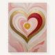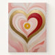 This is an abstract, symmetrical painting centered on a large heart motif that radiates outwards in concentric layers. The color palette is dominated by soft shades of pink and white, creating a gentle, flowing background texture that suggests organic movement or energy fields. The heart is defined by alternating bands of color, prominently featuring luminous gold leaf and a deep, solid red accent on the upper right side. The core of the heart is marked by a bright, yellow circle surrounded by smaller concentric rings. Delicate gold lines outline the major bands, emphasizing the structure and contributing to a sense of luxury and spiritual geometry. The overall composition is harmonious and uplifting.