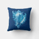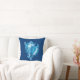 Throw pillow in a vintage sea life illustration of a conch shell, digitally enhanced and coloured in shades of blue and white, against a deep indigo blue background