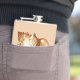 The flask itself is fine. It’s a cheap flask, obviously bought in bulk, however am prepared to overlook that. Given that it is a personalized item, I would have liked to have seen gift boxing instead of the generic packaging. Terrible printing, and/or quality. It’s a cheap, tacky vinyl. It is not cut straight and is also applied in a way that it is overhanging the bottom, causing the glue to catch on items and it will eventually roll and tear, damaging the wrap.