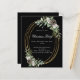 A black coloured background decorated with cones, white berries and greenry. A faux gold oval frame. Personalise and add the details.
