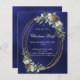 A navy blue, uneven coloured background decorated with cones, white berries and greenry. A faux gold oval frame. Personalise and add the details.