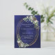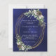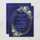For a winter wedding. A navy blue, uneven coloured background decorated with cones, white berries and greenry. A faux gold oval frame. Personalise and add your names and details.