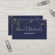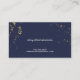 Splattered faux glitter (not real glitter, just an image of small gold/ochre colour dots) with her name printed in a handwritten font style, with profession and additional contact information on navy-blue business card