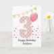 A colourful pink 3rd birthday girl card, which you can personalise with her name. The front of this colourful 3rd birthday card for her features the number three in a pink polka dot with a pink balloon ready to float away.The background has some colourful confetti and a soft gold bunting banner at the top.The inside message can be easily personalised if you wanted.