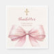 A cream, beige background color. Decorated with a large pink bow and a golden cross. Personalize and add the name and date.