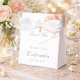 Chic white background decorated with watercolored pink and rose gold coloured roses, florals, flowers, eucalyptus greenery. A golden cross. With the text: Confirmation and Thank You written with a modern black coloured hand lettered style script. Personalise and a name and a date.