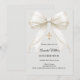Invite guests with this sophisticated Confirmation invitation. The design features a luxurious ivory satin bow draped with delicate pearls and a shimmering gold cross set against a soft dove grey background. It is a beautiful choice for a young girl celebrating her Confirmation.
